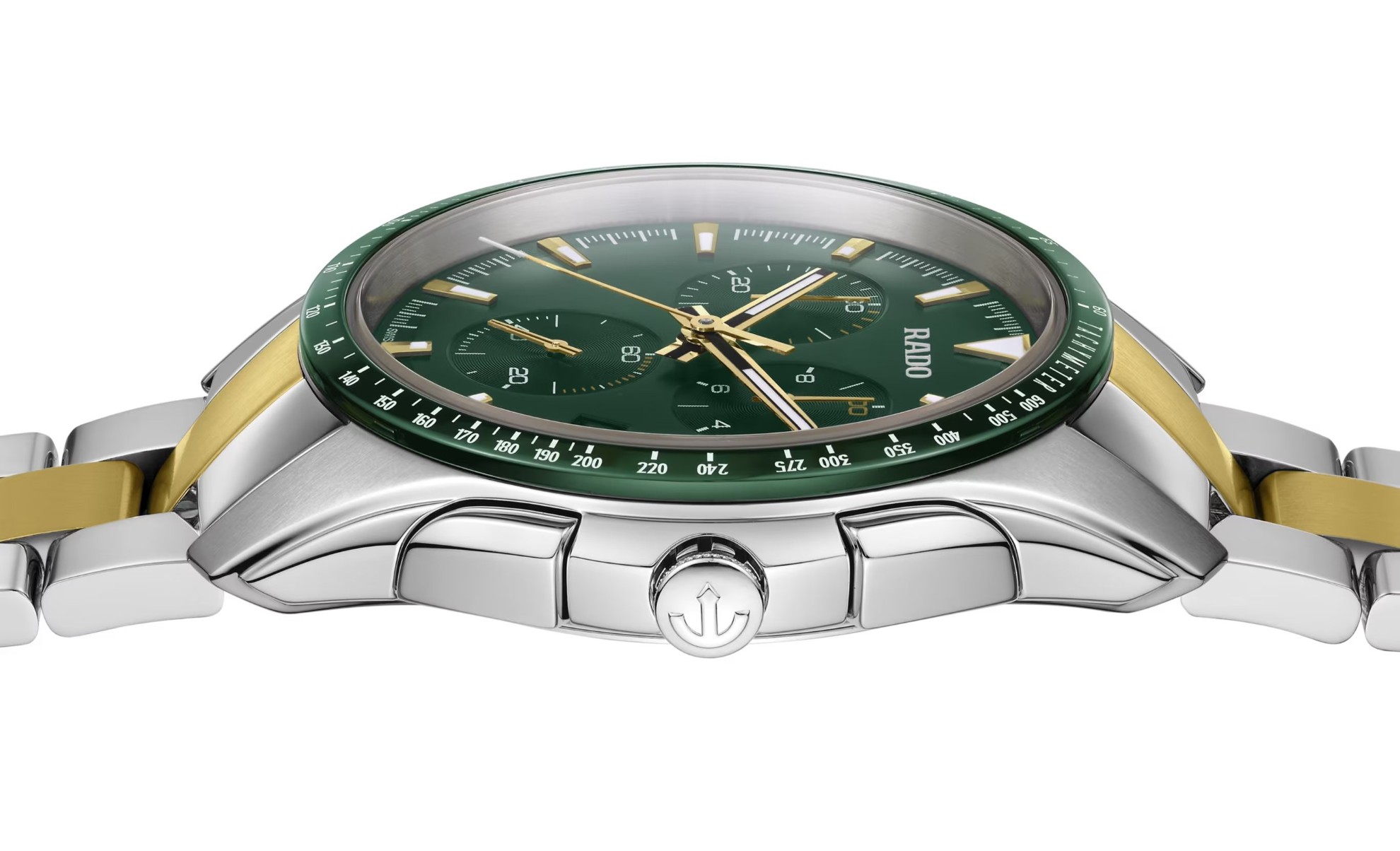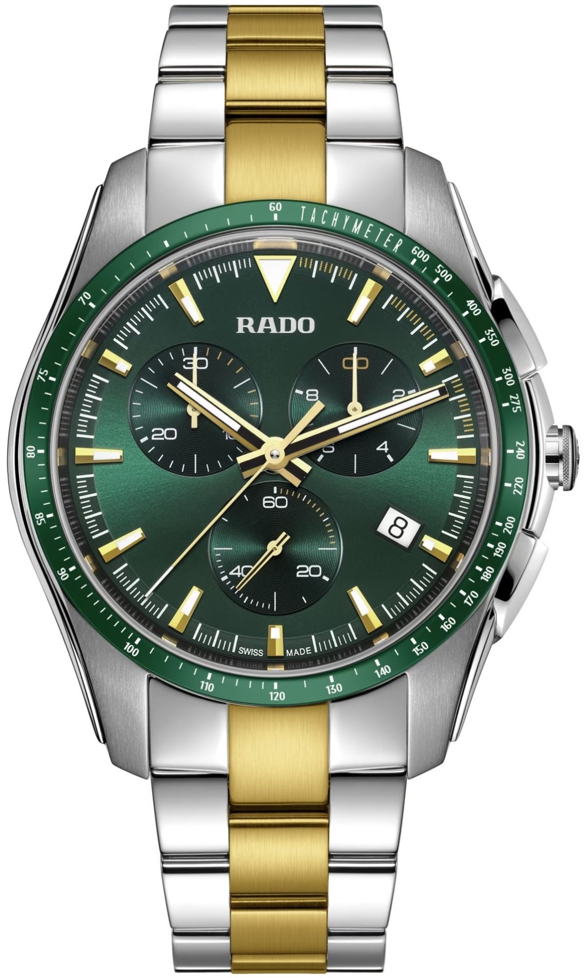 Rado HyperChrome Chronograph R32259323 jsou pánské sportovní hodinky s ocelovým náramkem s částečnou PVD úpravou zlaté barvy. Pouzdro z leštěné nerezové oceli má průměr 44,9 milimetru a lunetu s tachymetrickou stupnicí z materiálu High-Tech Ceramic, který je vysoce odolný vůči poškrábání. Zelený číselník s efektem slunečního brusu, stopkami a datumovkou na čtvrté hodině je chráněn safírovým sklem s oboustrannou antireflexní vrstvou pro minimalizování odlesků světla. Ručičky a indexy jsou potaženy luminiscenční vrstvou Super-LumiNova® pro lepší čitelnost i za zhoršených světelných podmínek. Chod hodinek zajišťuje švýcarský quartzový strojek. S vodotěsností 100 metrů jsou hodinky vhodnou volbou pro koupání a šnorchlování.
