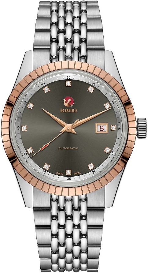 Rado HyperChrome Classic Automatic Diamonds R33100703 jsou pánské klasické hodinky na ocelovém náramku typu „beads of rice“, který svůj název získal proto, že jeho středové dílky připomínají zrnka rýže. Pouzdro z leštěné nerezové oceli má průměr 42 milimetrů a je vybaveno lunetou z materiálu Ceramos™, který je vysoce odolný vůči poškrábání. Šedý číselník s efektem slunečního brusu, 12 diamanty a datumovkou na třetí hodině je chráněn safírovým sklem s oboustrannou antireflexní vrstvou. Vteřinová ručička je vybavenou vrstvou Super-LumiNova® pro lepší viditelnost za zhoršených světelných podmínek. Průhledné dýnko umožňuje pohled na mechanický strojek R763 (03.763.143) s automatickým nátahem dekorovaný ženevskými pruhy, který disponuje rezervou chodu 80 hodin. Tento strojek s funkcí hackingu (zastavení vteřinové ručky při vytažení korunky do krajní polohy) je možné v případě potřeby natahovat i ručně. Díky použití antimagnetického vlásku setrvačky Nivachron™ z titanové slitiny je kalibr vysoce odolný vůči vlivům magnetického pole. Pro dosažení co nejvyšší možné přesnosti je stroj testován v pěti pozicích. S vodotěsností 5 ATM jsou hodinky odolné proti dešti a při sprchování. Systém EasyClip umožňuje rychlou a snadnou výměnu řemínků.