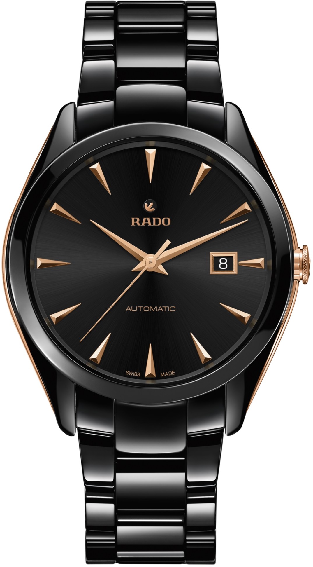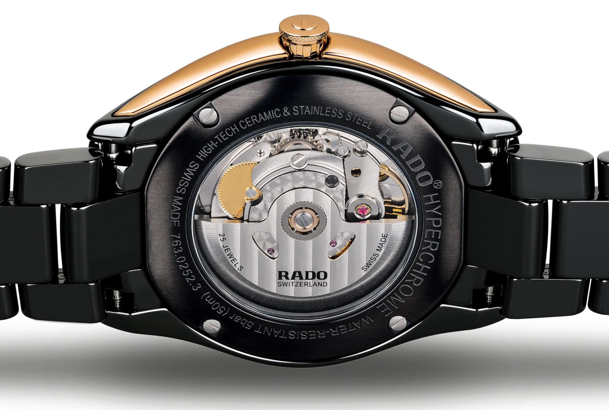 Rado HyperChrome R32252162 jsou pánské klasické hodinky vyrobené ze speciálního materiálu High-Tech Ceramic, který je vysoce odolný vůči poškrábání. Boky pouzdra a korunka jsou z nerezové oceli s PVD úpravou v barvě růžového zlata ladící s detaily na číselníku. Černý číselník s efektem slunečního brusu a datumovkou na třetí hodině je chráněn safírovým sklem s oboustrannou antireflexní vrstvou a pouzdrem o průměru 42 milimetrů. Průhledné dýnko nabízí pohled na mechanický strojek R763 (03.763.438) s automatickým nátahem, který disponuje rezervou chodu 80 hodin. Tento strojek s funkcí hackingu (zastavení vteřinové ručky při vytažení korunky do krajní polohy) je možné v případě potřeby natahovat i ručně. Díky použití antimagnetického vlásku setrvačky Nivachron™ z titanové slitiny je kalibr vysoce odolný vůči vlivům magnetického pole. Pro dosažení co nejvyšší možné přesnosti je stroj testován v pěti pozicích. S vodotěsností 5 ATM jsou hodinky odolné proti dešti a při sprchování.