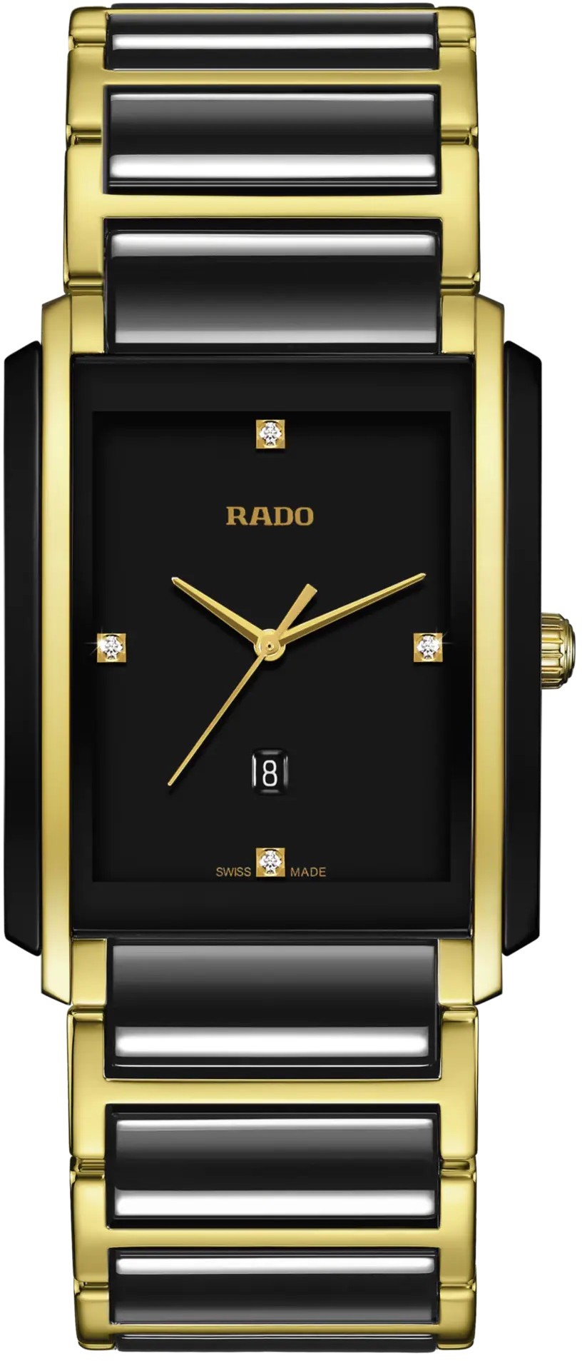 Rado Integral R20204712 jsou elegantní unisex hodinky s hranatým pouzdrem širokým 31 milimetrů. Materiál pouzdra i náramku tvoří kombinace vysoce odolného materiálu High-Tech Ceramic s leštěnou nerezovou ocelí opatřenou PVD úpravou zlaté barvy. Černý číselník s ukazatelem data a 4 diamanty je chráněn safírovým sklíčkem. Pohon hodinek zajišťuje švýcarský quartzový strojek. S vodotěsností 5 ATM jsou hodinky odolné proti dešti a při sprchování.