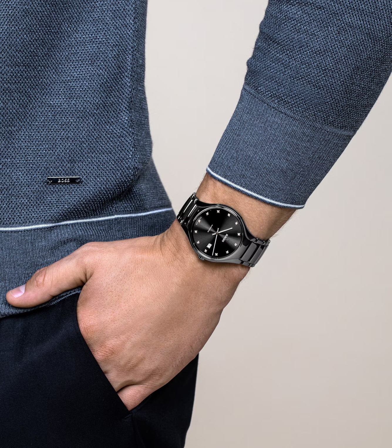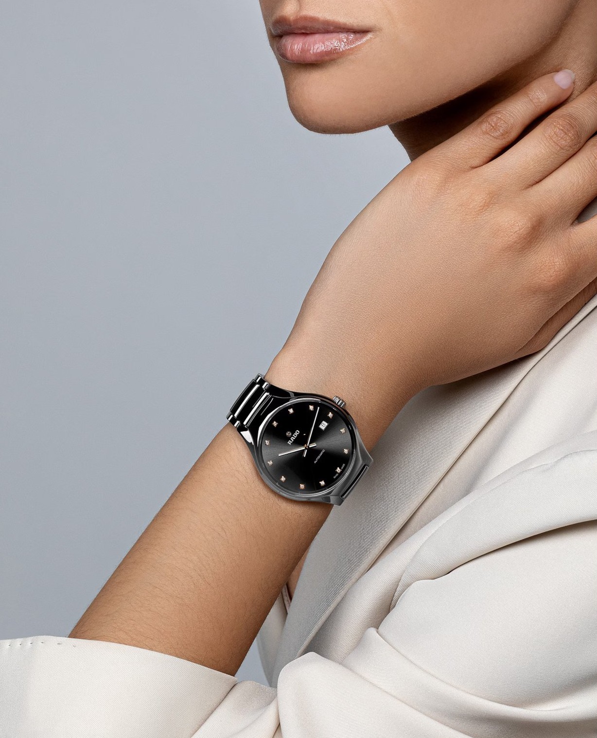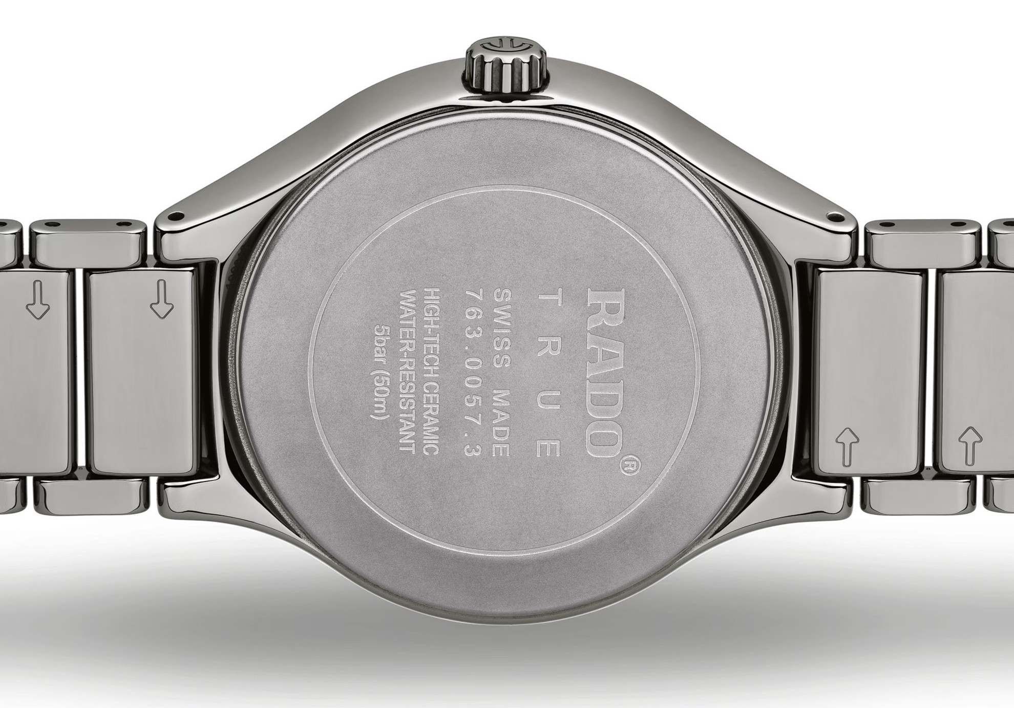 Rado True Automatic Diamonds R27057732 jsou elegantní unisex hodinky vyrobené ze speciálního materiálu Plasma High-Tech Ceramic. Díky tomuto materiálu jsou hodinky lehké, hypoalergenní a odolné vůči poškrábání. Pouzdro hodinek má průměr 40 milimetrů. Šedý číselník s efektem slunečního brusu doplněný 12 diamanty a ukazatelem data je chráněn safírovým sklem s oboustrannou antireflexní vrstvou. Ručičky v barvě růžového zlata jsou potaženy vrstvou Super-LumiNova® pro lepší čitelnost za zhoršených světelných podmínek. Pohon hodinek zajišťuje mechanický strojek R763 (03.763.932) s automatickým nátahem a rezervou chodu 80 hodin. Tento strojek s funkcí zastavení vteřinové ručky při vytažení korunky do krajní polohy, pro kterou se vžilo označení hacking, je možné v případě potřeby natahovat i ručně. Díky použití antimagnetického vlásku setrvačky Nivachron™ z titanové slitiny, je tento kalibr vysoce odolný vůči vlivům magnetického pole. Pro dosažení co nejvyšší možné přesnosti je stroj testován v pěti pozicích. Hodinky disponují vodotěsností 5 ATM a jsou tedy odolné proti dešti a při sprchování.