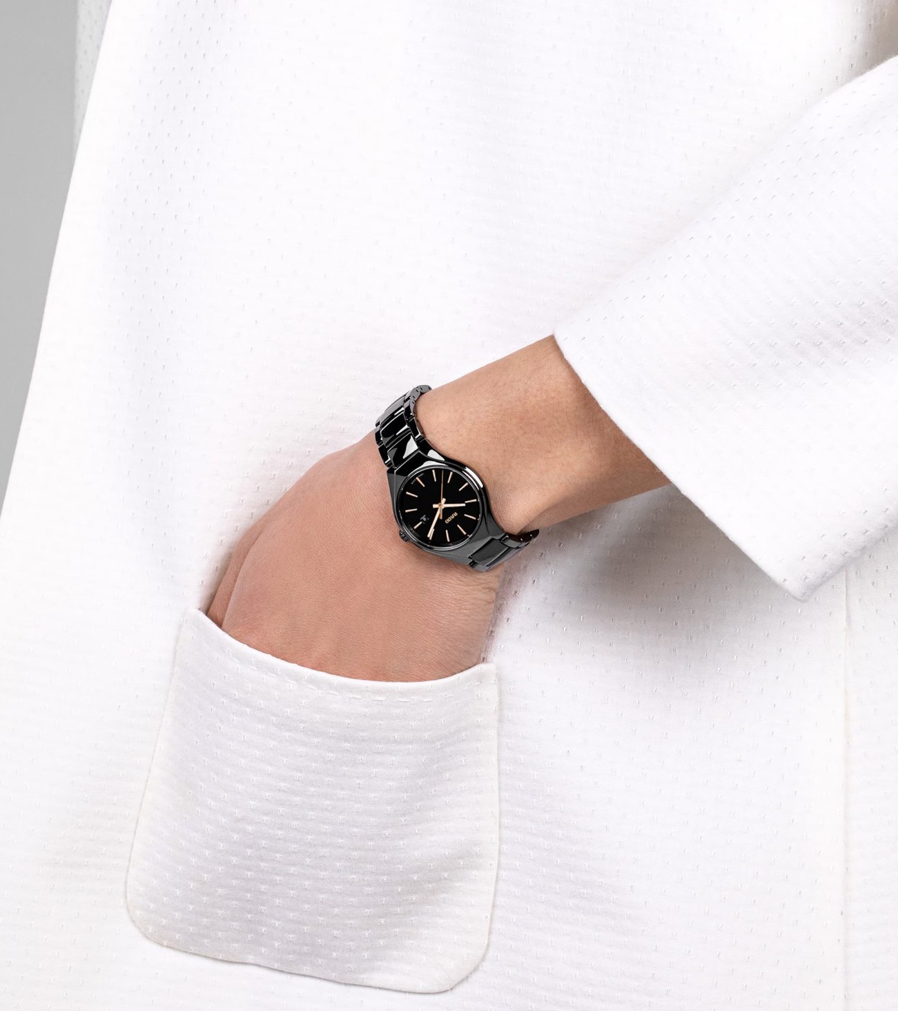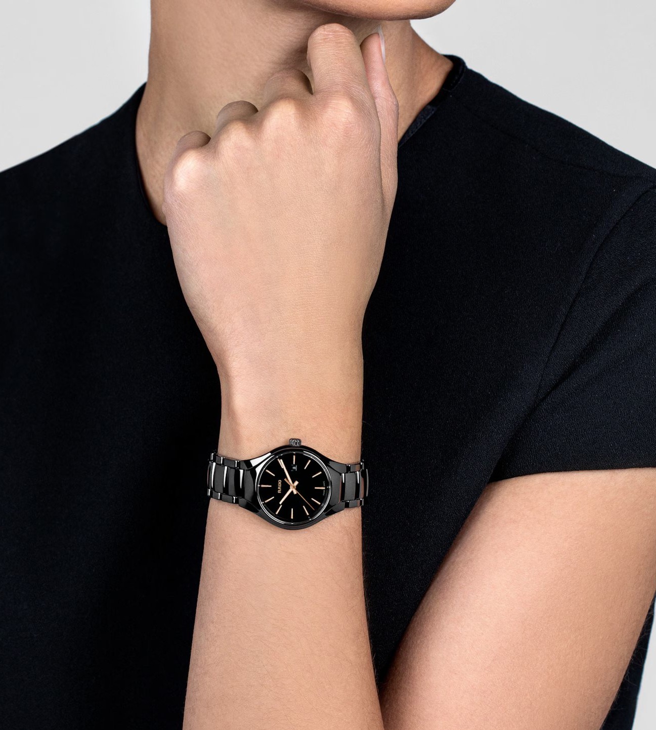 Rado True R27059162 jsou dámské elegantní hodinky vyrobené ze speciálního materiálu High-Tech Ceramic. Díky tomuto materiálu jsou hodinky lehké, hypoalergenní a odolné vůči poškrábání. Pouzdro hodinek má průměr 30 milimetrů. Černý číselník s ukazatelem data na třetí hodině je chráněn safírovým sklem s oboustrannou antireflexní vrstvou. Ručičky a indexy v barvě růžového zlata jsou potaženy vrstvou Super-LumiNova® pro lepší čitelnost za zhoršených světelných podmínek. Pohon hodinek zajišťuje švýcarský quartzový strojek. Hodinky disponují vodotěsností 5 ATM a jsou tedy odolné proti dešti a při sprchování.