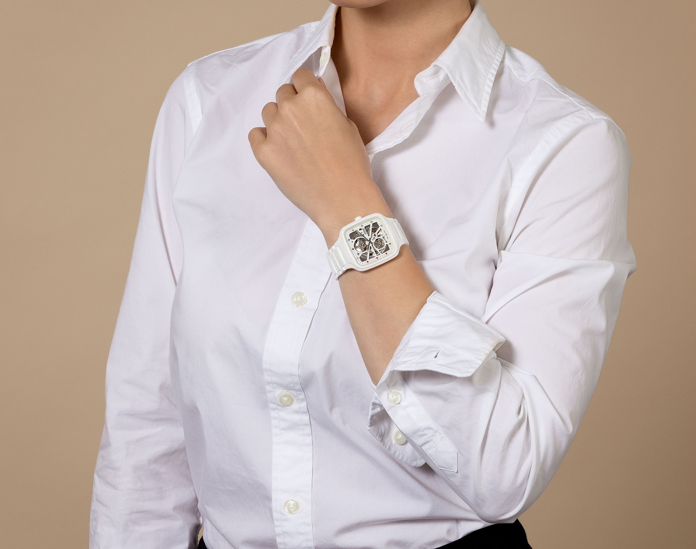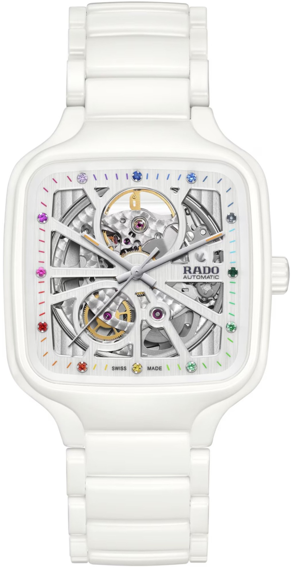 Rado True Square Automatic Open Heart R27073712 jsou elegantní dámské hodinky vyrobené ze speciálního materiálu High-Tech Ceramic v bílé barvě. Díky tomuto materiálu jsou hodinky lehké, hypoalergenní a odolné vůči poškrábání. Hranaté pouzdro je široké 38 milimetrů. Ručičky jsou pro lepší čitelnost za zhoršených světelných podmínek potaženy luminiscenční vrstvou Super-LumiNova®. Bílý skeletonový číselník zdobený 12 drahokamy v barvě duhy je chráněn odolným safírovým sklem s oboustrannou antireflexní vrstvou. Spolu s průhledným dýnkem nabízí pohled na mechanický strojek Rado R734 (03.734.431) s automatickým nátahem a rezervou chodu 80 hodin, dekorovaný perláží a ženevskými pruhy. Tento strojek s funkcí zastavení vteřinové ručky při vytažení korunky do krajní polohy, pro kterou se vžilo označení hacking, je možné v případě potřeby natahovat i ručně. Díky použití antimagnetického vlásku setrvačky Nivachron™ z titanové slitiny, je tento kalibr vysoce odolný vůči vlivům magnetického pole. Pro dosažení co nejvyšší možné přesnosti je stroj testován v pěti pozicích. Hodinky disponují vodotěsností 5 ATM a jsou tedy odolné proti dešti a při sprchování.