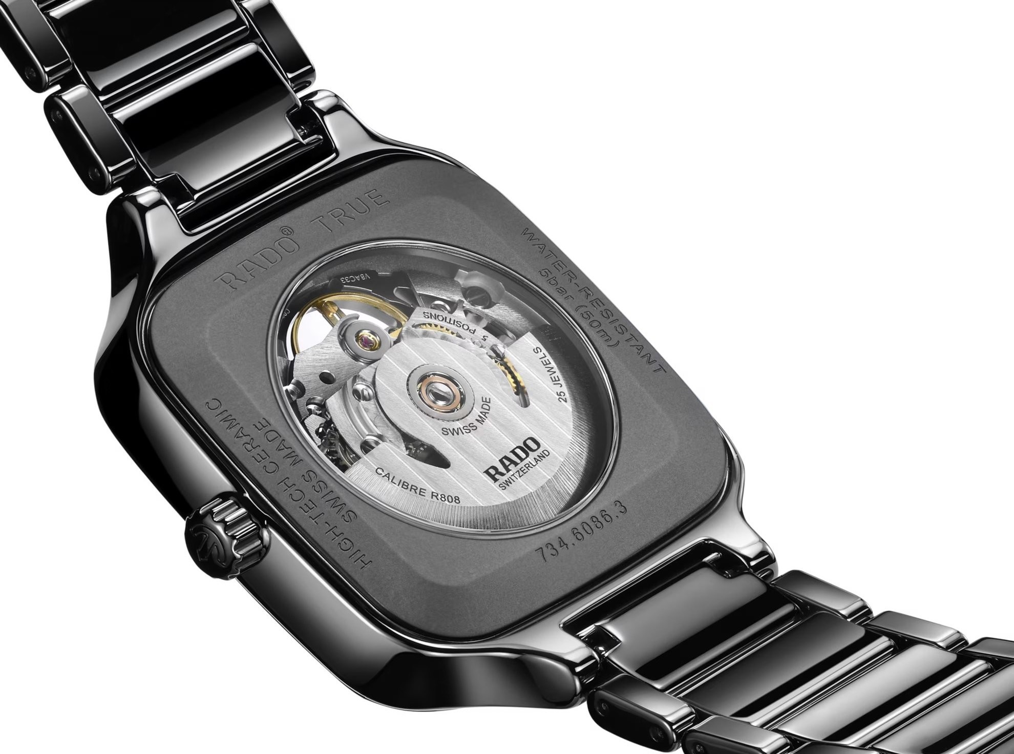 Rado True Square Automatic Skeleton R27124162 jsou elegantní unisex hodinky vyrobené ze speciálního materiálu High-Tech Ceramic v černé barvě. Díky tomuto materiálu jsou hodinky lehké, hypoalergenní a odolné vůči poškrábání. Hranaté pouzdro je široké 38 milimetrů. Ručičky a indexy v barvě růžového zlata jsou pro lepší čitelnost za zhoršených světelných podmínek potaženy luminiscenční vrstvou Super-LumiNova®. Černý skeletonový číselník chráněný safírovým sklem s oboustrannou antireflexní vrstvou nabízí spolu s průhledným dýnkem pohled na mechanický strojek Rado R808 (03.808.031) s automatickým nátahem a rezervou chodu 80 hodin, dekorovaný perláží a ženevskými pruhy. Tento strojek s funkcí zastavení vteřinové ručky při vytažení korunky do krajní polohy, pro kterou se vžilo označení hacking, je možné v případě potřeby natahovat i ručně. Díky použití antimagnetického vlásku setrvačky Nivachron™ z titanové slitiny, je tento kalibr vysoce odolný vůči vlivům magnetického pole. Pro dosažení co nejvyšší možné přesnosti je stroj testován v pěti pozicích. Hodinky disponují vodotěsností 5 ATM a jsou tedy odolné proti dešti a při sprchování.