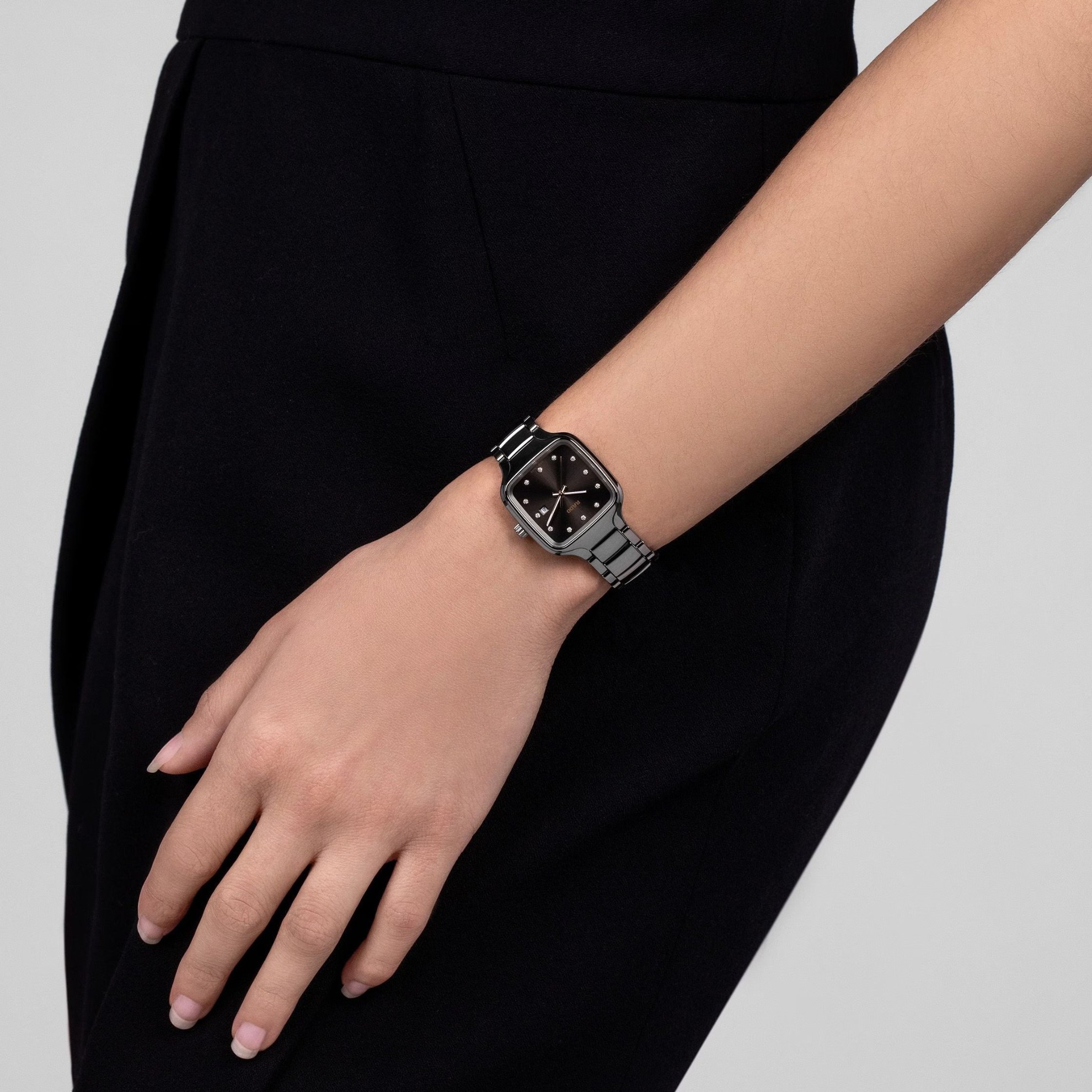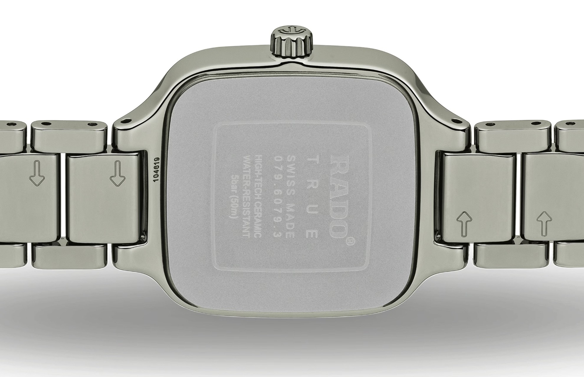 Rado True Square Diamonds R27079702 jsou dámské elegantní hodinky vyrobené ze speciálního materiálu Plasma High-Tech Ceramic. Díky tomuto materiálu jsou hodinky lehké, hypoalergenní a odolné vůči poškrábání. Hranaté pouzdro hodinek je široké 29 milimetrů. Šedý číselník s efektem slunečního brusu, 12 diamanty o hmotnosti 0,096 ct a ukazatelem data na třetí hodině je chráněn safírovým sklem. Ručičky v barvě růžového zlata jsou pro lepší čitelnost za zhoršených světelných podmínek potaženy luminiscenční vrstvou Super-LumiNova®. Pohon hodinek zajišťuje švýcarský quartzový strojek R079. Hodinky disponují vodotěsností 5 ATM a jsou tedy odolné proti dešti a při sprchování.