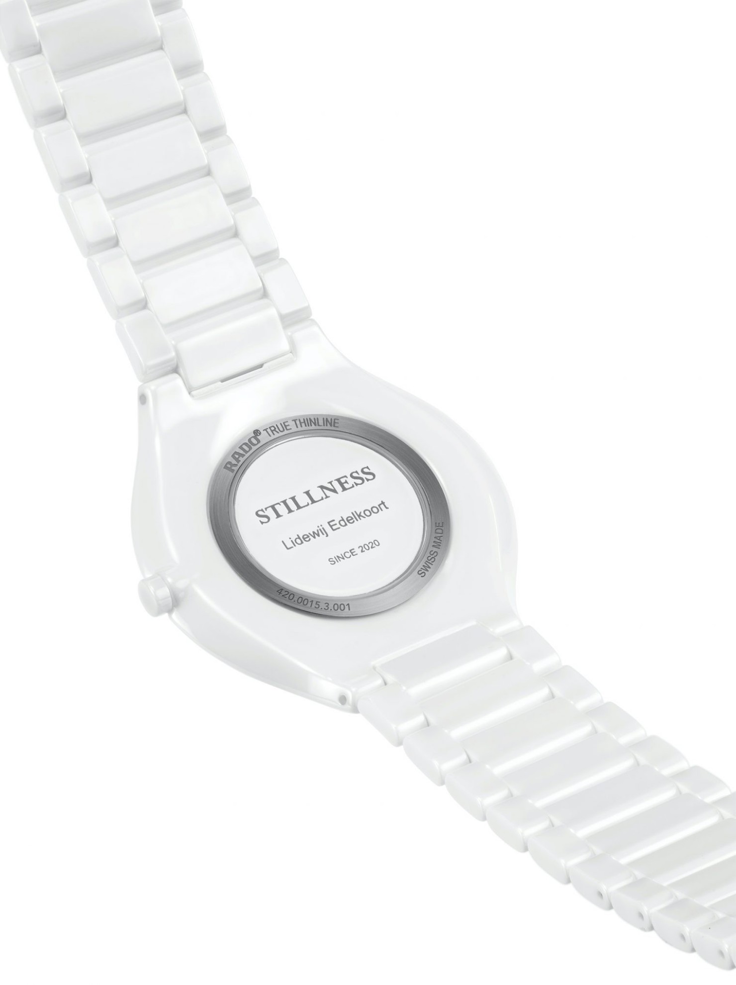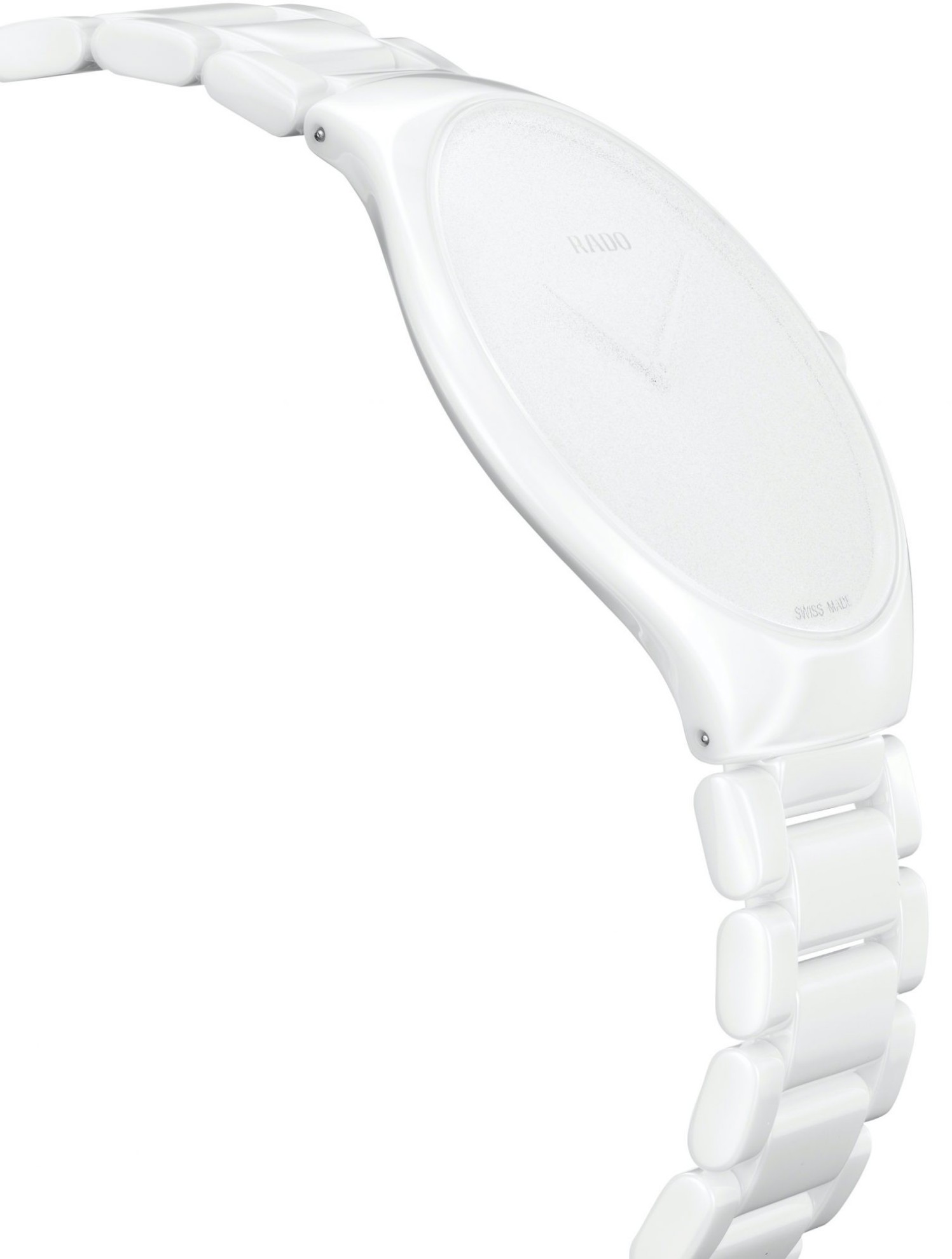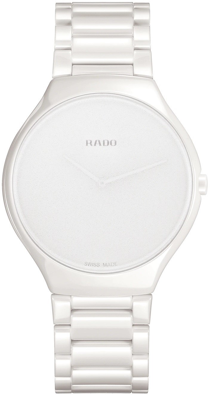 Rado True Thinline Stillness R27015012 jsou elegantní unisex hodinky vyrobené ze speciálního materiálu High-Tech Ceramic v bílé barvě. Díky tomuto materiálu jsou hodinky lehké, hypoalergenní a odolné vůči poškrábání. Ultratenké pouzdro hodinek má průměr 39 milimetrů a tloušťku pouhých 5 milimetrů. Bílý číselník ve velmi minimalistickém designu je chráněn odolným safírovým sklem. Pohon hodinek zajišťuje švýcarský quartzový strojek R420. Hodinky disponují vodotěsností 3 ATM a jsou tedy odolné proti vlhkosti, dešti a při mytí rukou. Tento model odrážející ducha moderní doby byl vytvořen ve spolupráci s Li Edelkoort, která se zabývá prognózou trendů.