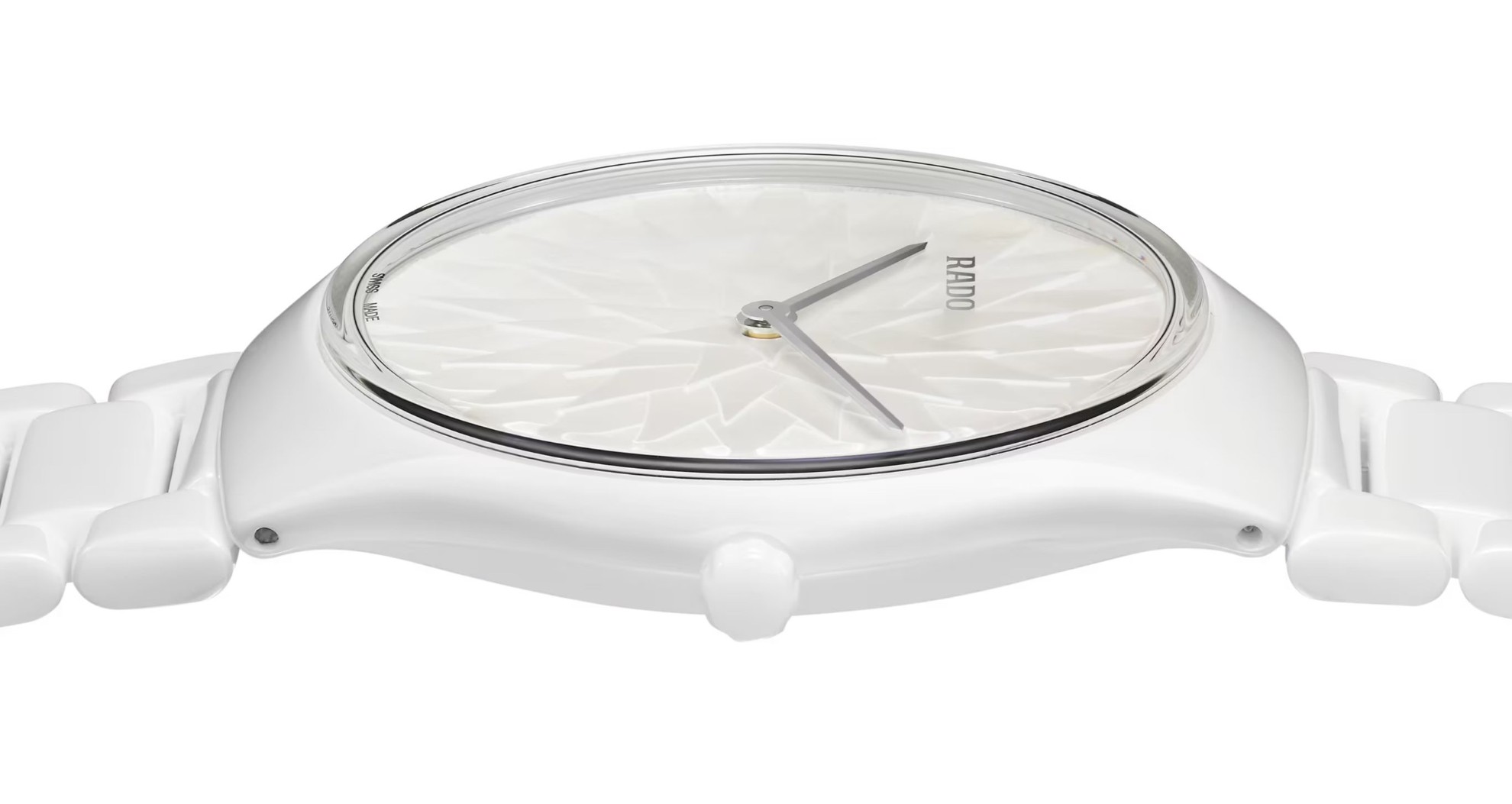 Rado True Thinline X Great Gardens of the World Chapter 9 R27118902 jsou dámské elegantní hodinky vyrobené ze speciálního materiálu High-Tech Ceramic v bílé barvě. Díky tomuto materiálu jsou hodinky lehké, hypoalergenní a odolné vůči poškrábání. Ultratenké pouzdro hodinek má průměr 40 milimetrů a tloušťku pouhých 9 milimetrů. Perleťový číselník se vzorem inspirovaným listy jednoho z nejstarších stromů na Zemi - blahočetem čilským je chráněn odolným safírovým sklem s oboustrannou antireflexní vrstvou a jeho krása vyniká zejména pod přímým světlem, kdy můžeme pozorovat hru barev perleti. Částečně průhledné dýnko nabízí pohled na mechanický strojek Rado R766 (03.766.731) s automatickým nátahem a rezervou chodu 72 hodin. Tento strojek s funkcí zastavení vteřinové ručky při vytažení korunky do krajní polohy, pro kterou se vžilo označení hacking, je možné v případě potřeby natahovat i ručně. Díky použití antimagnetického vlásku setrvačky Nivachron™ z titanové slitiny, je tento kalibr vysoce odolný vůči vlivům magnetického pole. Pro dosažení co nejvyšší možné přesnosti je stroj testován v pěti pozicích. Hodinky disponují vodotěsností 3 ATM a jsou tedy odolné proti vlhkosti, dešti a při mytí rukou.