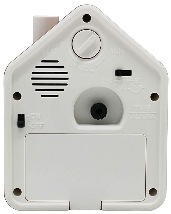 Funkce:  Tichý plynulý chod vteřinové ručičky, Volitelný alarm (2 ptačí písně/pípání), Funkce opakovaného buzení, Ovládání hlasitosti