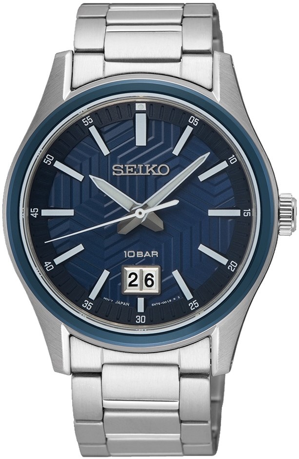 Pánské bateriové hodinky Seiko Quartz SUR559P1 na kovovém náramku s překlápěcí sponou. Pouzdro z nerezové oceli má průměr 39,5 milimetru a lunetu s modrou povrchovou PVD úpravou. Modrý texturovaný číselník s indikací data v provedení big date je chráněn odolným sklem Hardlex. Aplikované hodinové indexy jsou stejně jako ručky pokryty luminiscenčním nátěrem LumiBrite, který garantuje perfektní čitelnost za zhoršených světelných podmínek. Pohon hodinek zajišťuje spolehlivý quartzový strojek 6N76. Vodotěsnost hodinek činí 10 ATM a jsou tedy vhodné pro koupání nebo šnorchlování.
