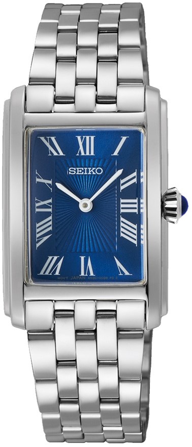 Dámské bateriové hodinky Seiko Quartz SWR085P1 na kovovém náramku s překlápěcí sponou. Obdélníkové pouzdro z nerezové oceli má průměr 22,2 milimetru a korunku osazenou modrým kabošonem, který ladí s číselníkem. Tyto univerzální hodinky v klasickém designu vhodně doplní váš každodenní outfit. Modrý číselník zdobený jemnou centrální texturou je chráněn odolným sklem Hardlex. Pohon hodinek zajišťuje spolehlivý quartzový strojek 4N30. Vodotěsnost hodinek činí 5 ATM a jsou tedy odolné proti dešti a při sprchování.